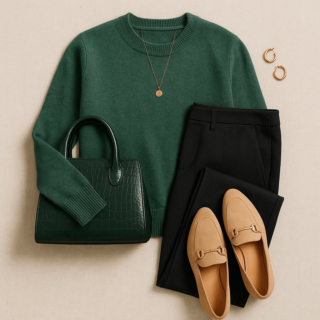 • Black trousers + emerald jumper + gold earrings + structured tote